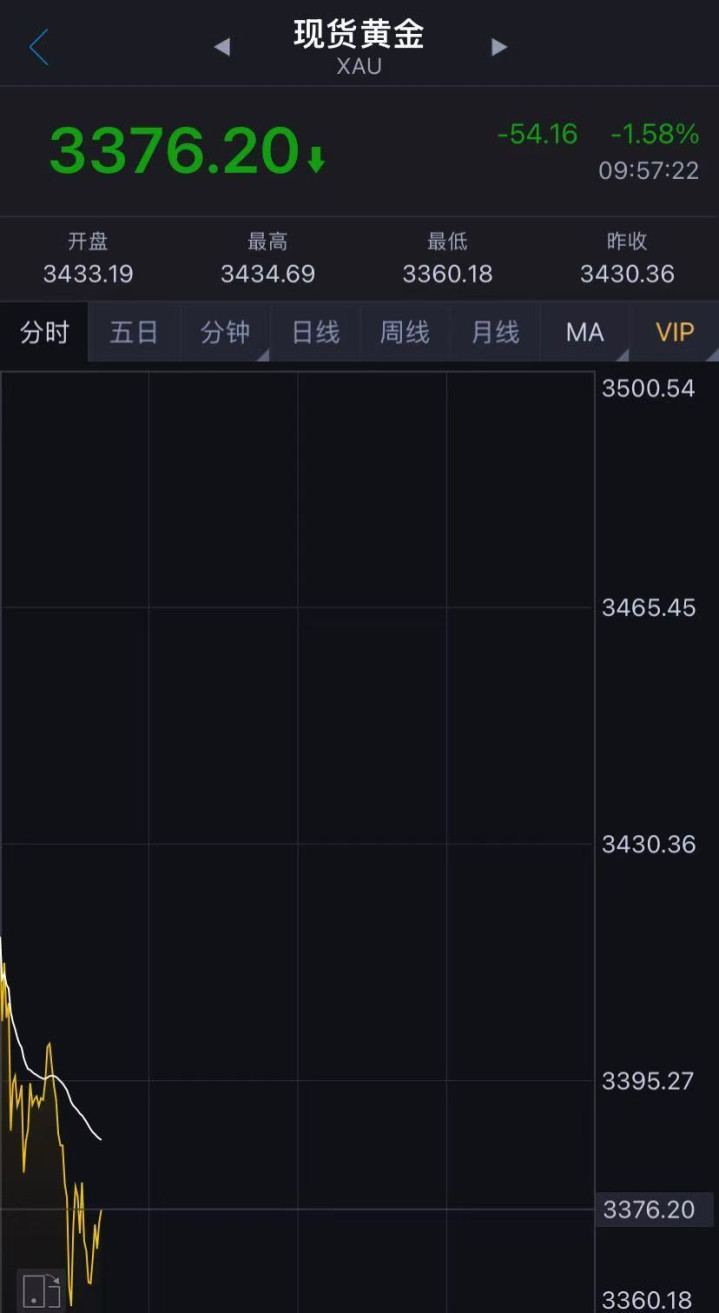 北京时间5月7日上午,现货黄金日内大跌2.00%,报3361.82美元/盎司。截至发稿,现货黄金跌近1.6%,现报3376.2美元/盎司。