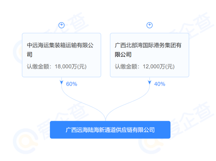 近日,广西远海陆海新通道供应链有限公司注册成立,该公司由中远海控全资子公司中远海运集装箱运输有限公司、广西北部湾国际港务集团有限公司共同持股,中远海运集运持股60%,北部湾港集团持股40%。
